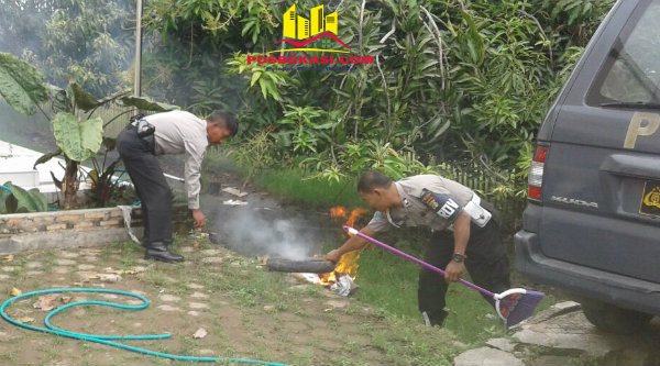 Bersama Kanit Patroli Aipda M Muji dan anggota melakukan kerja bakti dengan membersihkan dan membakar sampah serta menyiram tanaman yang tumbuh di pekarangan Mapolsek.