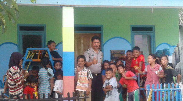 Dengan maksud menghilangkan trauma korban banjir, Bripka Wahyudin mengajak anak-anak PAUD Melati yang tidak jauh dari Kantor Desa Pantai Harapan Jaya.