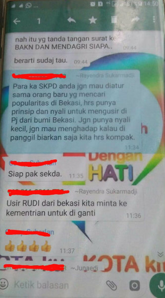 “Saya harap teman2 Karena SKPD kita sehingga bersama 2 belasan tahun bahkan puluhan tahun masa hrs dipatahkan dgn datangnya seorang Pj Walikota dari Bdg (Bandung) mari kita usir dia dari bumi Bekasi biarkan dia bekerja sendiri dan jujur saya sangat kecewa kalau diantara teman2 ada yg msh ada yg komunikasi dengan Pj Walikota”.[]