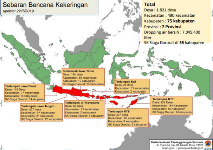 Data BNPB Senin 22 Juli 2019, 75 kabupaten dan kota terdampak kekeringan yaitu Jawa Barat 21 kabupaten, Banten 1, Jawa Tengah 21, DI Yogyakarta 2, Jawa Timur 10, Bali 2, NTT 15, dan NTB 9. Dilihat sebaran bencana kekeringan berdasarkan tingkatan wilayah administrasi sebagai berikut 7 provinsi, 75 kabupaten, 490 kecamatan, dan 1.821 desa.
