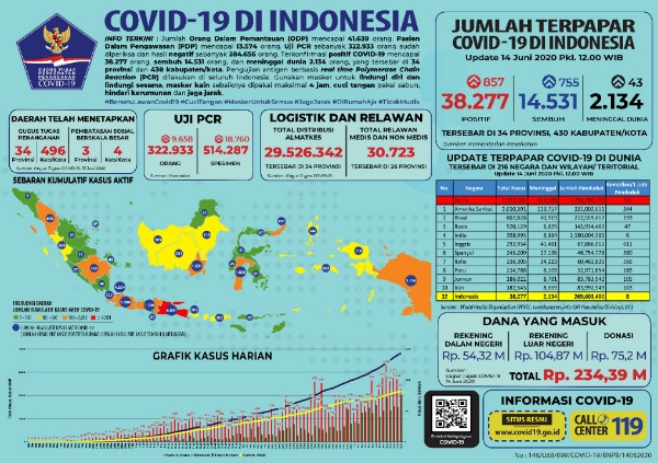 POSBEKASI.COM | JAKARTA – Gugus Tugas Percepatan Penanganan COVID-19 (Gugus Tugas Nasional) mencatat penambahan kasus terkonfirmasi positif COVID-19, Ahad (14/6/2020) totalnya menjadi 38.276 setelah ada penambahan sebanyak 856 orang. Kemudian untuk pasien sembuh menjadi 14.531 setelah ada penambahan sebanyak 755 orang. Selanjutnya untuk kasus meninggal menjadi 2.134 dengan penambahan 43.