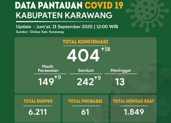 POSBEKASI.COM | KARAWANG – Jumlah warga Karawang yang terinfeksi virus corona tembus 400 orang. Data gugus tugas percepatan penanganan (GTPP) Covid-19 Karawang per Jumat (11/9/2020), total sudah 404 orang terinfeksi, dengan rincian 149 orang dalam perawatan, dinyatakan sembuh 242 orang dan meninggal dunia 13 orang.