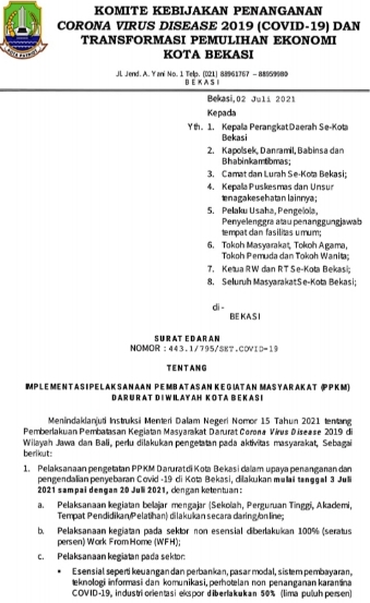 *1*. Pelaksanaan pengetatan PPKM Darurat Kota Bekasi dalam upaya penanganan dan pengendalian penyebaran Covid-19 di Kota Bekasi, dilakukan *mulai tanggal 3 Juli 2021 sampai dengan 20 Juli 2021*, dengan ketentuan: