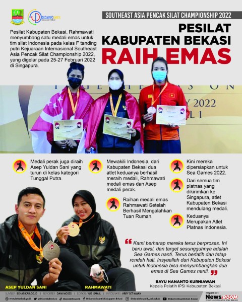 POSBEKASI.com | CIKARANG – Pesilat Kabupaten Bekasi, Rahmawati menyumbang satu medali emas untuk tim silat Indonesia pada kelas F tanding putri Kejuaraan Internasional Southeast Asia Pencak Silat Championship 2022, yang digelar pada 25-27 Februari 2022 di Singapura.[*]