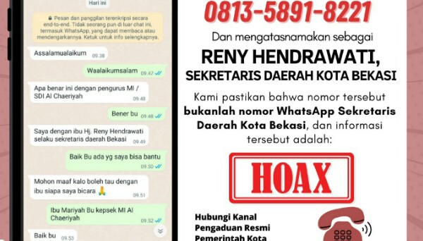 Sekretaris Daerah Kota Bekasi Reny Hendrawati mengaku namanya dicatut seseorang dengan memakai nomor telepon 081358918221. “Dipastikan bahwa nomor tersebut bukanlah nomor WA Sekda Kota Bekasi dan informasi tersebut adalah Hoax,” kata Reny dikutip dalam keterangannya, Selasa 19 April 2022.