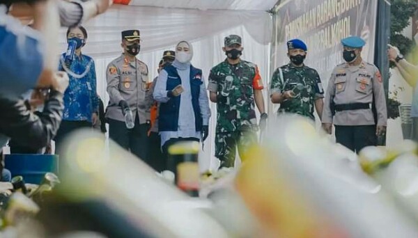 Kapolres Karawang AKBP Aldi Subartono, Bupati Karawang Cellica Nurrachadiana, Dandim 0604/Karawanh Letkol Kav Makhdum HR, Ketua MUI Karawang, saat pemusnahan barang bukti minuman keras dan petasan hasil Operasi Pekat di halaman Mapolres Karawang, Jumat 22 April 2022. [Posbekasi.com /Istimewa]