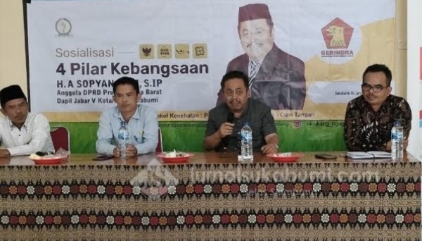 POSBEKASI.com | SUKABUMI – Anggota DPRD Provinsi Jawa Barat, HA Sopyan BHM menggelar sosialisasi Empat Pilar Kebangsaan dihadiri langsung tokoh masyarakat, pemuda dan warga Kampung Sindangraja RT01/02, Desa Cicukang, Kecamatan Purbaya, Kabupaten Sukabumi.