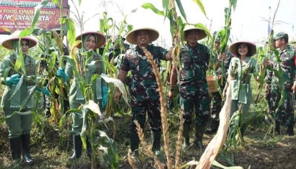 POSBEKASI.com | CIKARANG – Pangdam Jaya/Jayakarta Mayjen TNI Untung Budiharto beserta Ketua Persit KCK PD Jaya Ibu Gustina Untung Budiharto, didampingi Danrem 051/Wkt Brigjen TNI Yustinus Nono Yulianto, melakukan panen raya jagung di lahan Food Estate Terpadu Korem 051/Wkt, Desa Wanajaya, Kecamatan Cibitung, Kabupaten Bekasi, Selasa 19 Juli 2022. [Posbekasi.com /Kodam Jaya]