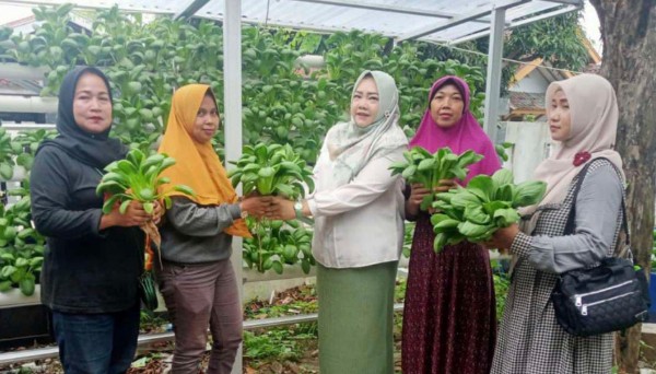 POSBEKASI.com | CIBARUSAH – Kepala Desa Sindangmulya, Selpia Indriyani berbagi sayuran hidroponik secara gratis kepada warga hasil panen merupakan uji coba ketahanan pangan yang dilakukan para kader PKK di desanya.