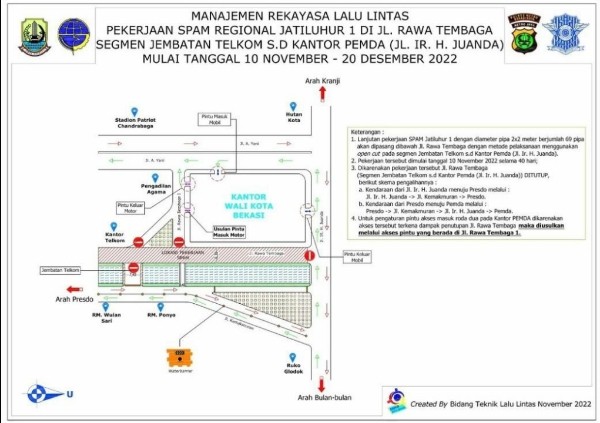 POSBEKASI.com | BEKASI – Dinas Perhubungan Kota Bekasi rekayasa lalu lintas dengan adanya lanjutan pekerjaan rancang bangun SPAM Regional Jatiluhur 1 pada Jl. Rawa Tembaga segmen jembatan Telkom sampai Jl. Ir. H. Juanda kantor Pemerintah Kota Bekasi, Senin 21 November 2022.