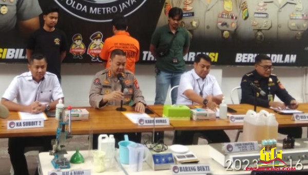 POSBEKASI.com | JAKARTA – Ditresnarkoba Polda Metro Jaya bekerjasama dengan Bea Cukai Bandara Soekarno Hatta (Soetta) menggerebek sindikat narkoba jaringan internasional jenis sabu yang dijadikan cairan rokok elektrik (liquid vape) dalam kemasan di rumah kontrakan Jalan Melati, Meruya Utara, Kembangan, Jakarta Barat.