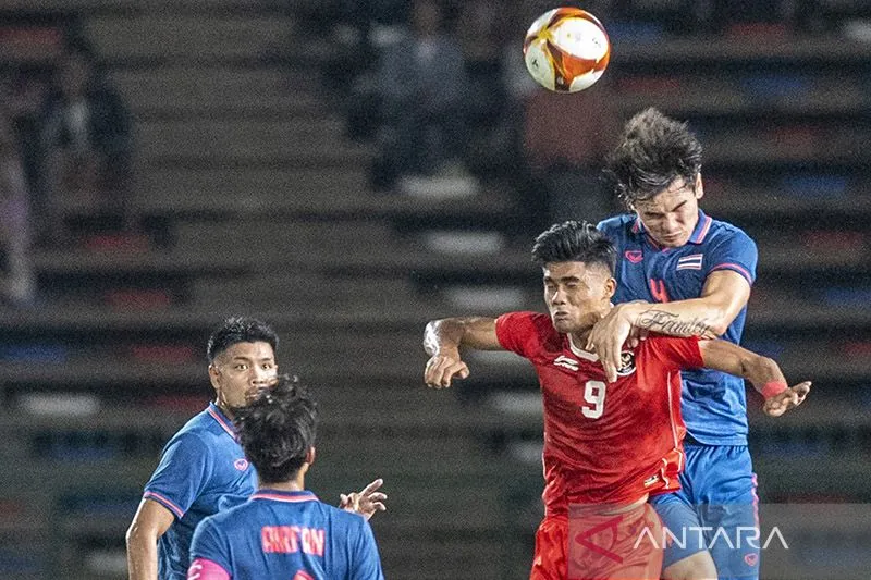 Pesepak bola Timnas Indonesia U-22 Ramadhan Sananta (kedua kanan) berebut bola di udara dengan pesepak bola Timnas Thailand Jonathan Khemdee (kanan) saat pertandingan Final Sepak Bola SEA Games 2023 di National Olympic Stadium, Phnom Penh, Kamboja, Selasa (16/5/2023). ANTARA FOTO/M Agung Rajasa/rwa/am