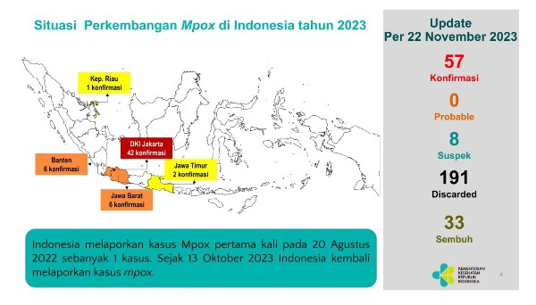 Secara Nasional tercatat hingga 22 November 2023 sebanyak 57 pasien konfirmasi Mpox di Indonesia sejak pertama kali dilaporkan pada 22 November 2023. Pasien Mpox di dominasi di DKI jakarta sebanyak 42 pasien, diikuti Banten sebanyak 6 kasus, Jawa Barat sebanyak 6 kasus, Jawa Timur sebanyak 2 kasus, dan Kepulauan Riau sebanyak 1 kasus.