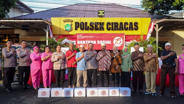 posBEKASI.com | JAKARTA – Kapolres Metro Jaktim Kombes Pol Nicolas Ary Lilipaly memberikan bansos sembako kepada Purnawirawan Polri dalam rangka Hari Bhayangkara ke-78 di halaman Polsek Ciracas Jakarta Timur, Jumat (28/6/204). Kegiatan ini dihadiri PJU Polres Metro Jakarta Timur, Kapolsek Ciracas, Bhayangkari dan para Purnawirawan Polri yang ada di Komplek Polri Ciracas.