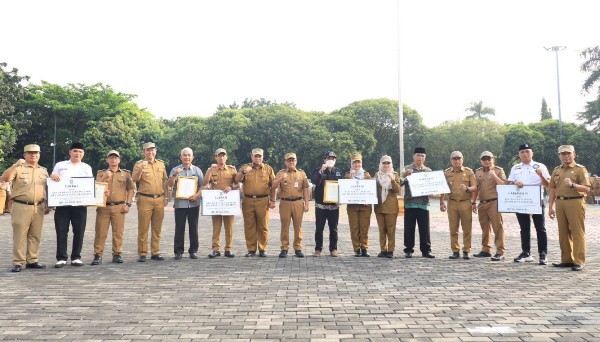 memberikan penghargaan kepada Lembaga Pemberdayaan Masyarakat (LPM) pemenang hasil penilaian Bulan Bhakti Gotong Royong Masyarakat (BBGRM) tanpa dihadiri LPM Bojong Menteng di Lapangan Plaza Pemkot Bekasi, Senin (12/8/2024). [PosBekasi.com /Ist]