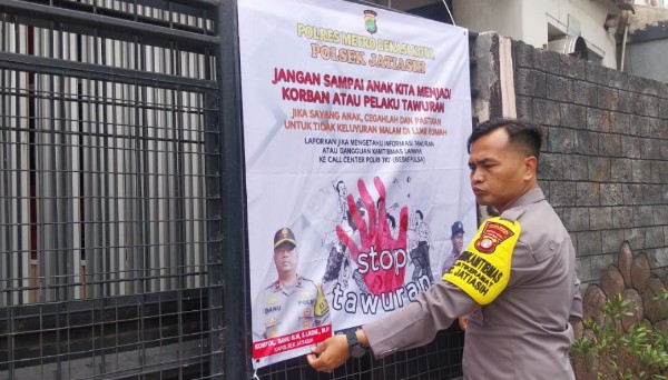 “Spanduk yang dipasang berisi pesan ajakan kepada warga untuk bersama-sama menolak keras aksi tawuran di kalangan remaja dan pelajar,” ungkap Aipda Setyo Wardoyo.