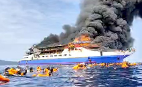 posBEKASI.com | MANADO – Bakamla RI melalui unsur KN Gajah Laut-404 dan HSC 32-03 melakukan aksi cepat tanggap darurat dalam membantu proses evakuasi penumpang KMP Barcelona 5 yang mengalami musibah kebakaran di perairan Pulau Talise, Kecamatan Likupang Barat, Kabupaten Minahasa Utara (Minut), Sulawesi Utara, Ahad (20/7/2025). Sebagian penumpang terjun menyelamatkan diri ke laut dan 5 korban meninggal dunia.