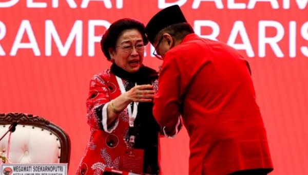 Pelukan itu dibalas Megawati dengan tangis haru, diiringi tepuk tangan para kader yang berdiri menyaksikan momen tersebut.