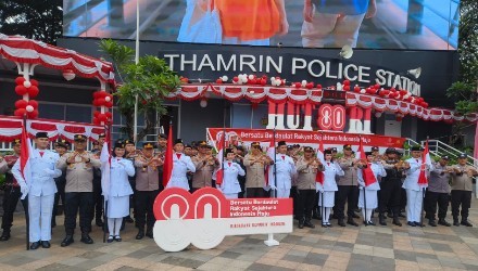 JAKARTA | posBEKASI.com – Menyambut HUT RI ke-80, jajaran Polres Metro Jakarta Pusat bersama Paskibra DKI Jakarta menggelar kegiatan pemutaran lagu kebangsaan Indonesia Raya di Thamrin Police Station, Bundaran Hotel Indonesia (HI), dimulai pukul 09.45 WIB saat pasukan pembawa bendera memasuki area pukul 10.00 WIB, lagu kebangsaan Indonesia Raya diputar dengan khidmat, diikuti sikap siap seluruh peserta, Kamis 14 Agustus 2025.