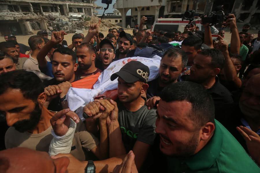 Puluhan warga Palestina, termasuk rekan-rekan jurnalis dan fotografer, berkumpul di halaman rumah sakit untuk melaksanakan salat jenazah. Di antara mereka terdapat anggota keluarga, rekan kerja, dan warga yang telah mengetahui pekerjaan para jurnalis tersebut selama bertahun-tahun.