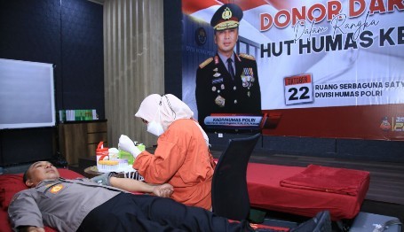 Donor darah Divisi Humas Polri digelar serentak seluruh jajaran Bidang Humas Polda dan Polres, terlihat Kadiv Humas Polri Irjen Pol Shandi Nugroho turut donor darah dalam rangka memperingati Hari Jadi Humas Polri ke-74 Tahun 2025.