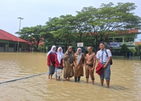 Penampakan guru dan siswa di tengah rendaman banjir sekolah SMA Negeri 2 Sukatani yang melanda 7 kecamatan di wilayah Kabupaten Bekasi, mendapat bantuan pembersihan lumpur pasca-banjir sejak sepekan terakhir dari “Tim Relawan Sobat Bang Syahrir” yang merupakan anggota DPRD Jawa Barat dari daerah pemilihan Jabar IX (Kabupaten Bekasi). Posbekasi.com /Ist